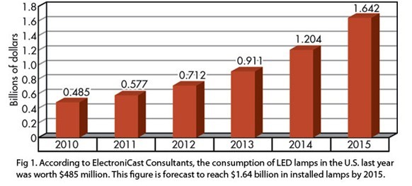 ElectroniCast Consultants最近公布的市場(chǎng)研究報(bào)告認(rèn)為,去年美國(guó)消費(fèi)的LED燈泡價(jià)值4.85億美元。該公司預(yù)測(cè),以2015年該數(shù)字將達(dá)到16.4億美元。