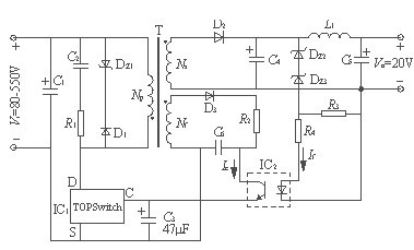 第七步確定反饋繞組的參數(shù),反饋是反激的電壓,其電壓是取自輸出級的,所以反饋電壓是穩(wěn)定的,TOP 的電源電壓是5.7到9V,繞上7匝,那么其電壓大概是6V多,這就可以了,記得,反饋電壓是反激的,其匝數(shù)比要和幅邊對應(yīng),懂什么意思嗎,至于線,因?yàn)榱鬟^其的電流很小,所以就用繞原邊的線繞就可以了,無嚴(yán)格的要求.