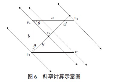 同時(shí)初始設(shè)置時(shí)可以根據(jù)虛擬觸摸屏的長寬和每個(gè)棋盤格在圖像上的投影確定攝像頭拍攝的每個(gè)棋盤格平行光的斜率。放大圖5 中的棋盤格s,得到圖6。假設(shè)攝像頭c1以斜率k平行拍攝由頂點(diǎn)v1、v2、v3、v4組成的棋盤格s,其邊(v4,v3)的長度為a,在圖像平面上的投影(v3,v5)的長度為a′,其邊(v1,v4)的長度為b,在圖像平面的投影(v1,v5)的長度為b′。已知虛擬觸摸屏的長寬,每個(gè)棋盤格的長a 和寬b 分別為其1/n,a′、b′可從拍攝的圖像上獲得,于是從攝像頭拍攝該棋盤格的平行光的斜率k 可由下式獲得: